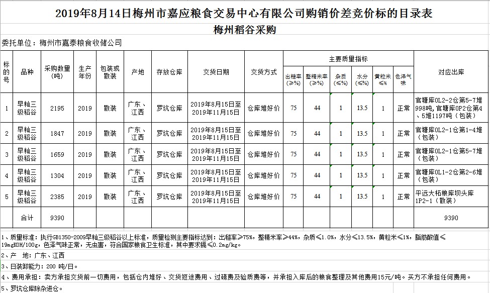 受客戶委托,梅州市嘉應(yīng)糧食交易中心有限公司定于2019年8月14日(星期三)舉辦稻谷購銷價(jià)差聯(lián)動(dòng)標(biāo)的交易會(huì),梅州市嘉泰糧食收儲(chǔ)公司擬銷售和采購早秈稻9390噸。