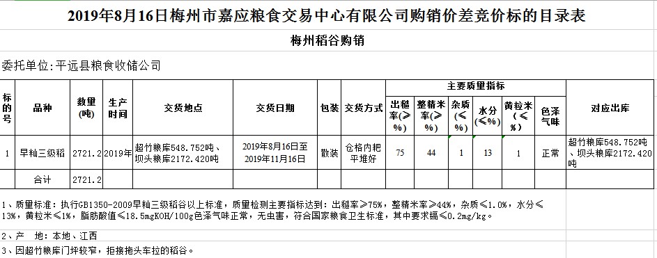 交易時間和地點:20198月16日(星期五)上午10時15分。廣東省梅州市彬芳大道南161號梅州市糧食交易中心3樓。