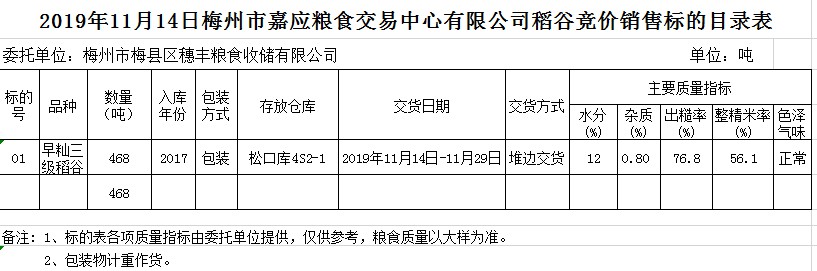 交易時(shí)間和地點(diǎn):2019年11月14日(星期四)上午10時(shí)。廣東省梅州市彬芳大道南161號(hào)梅州市糧食交易中心3樓。