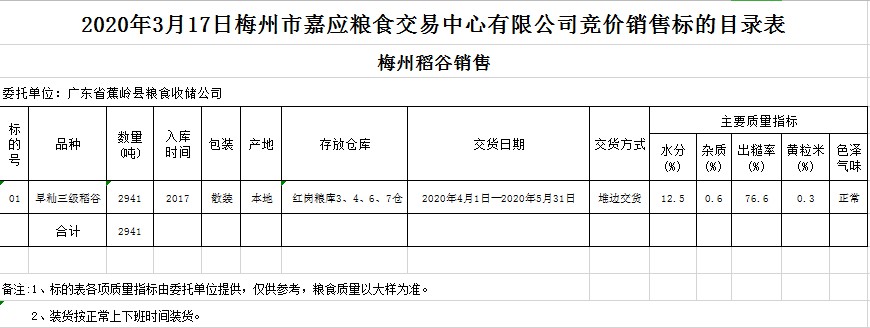 2020年3月17日廣東省蕉嶺縣糧食收儲公司稻谷銷售