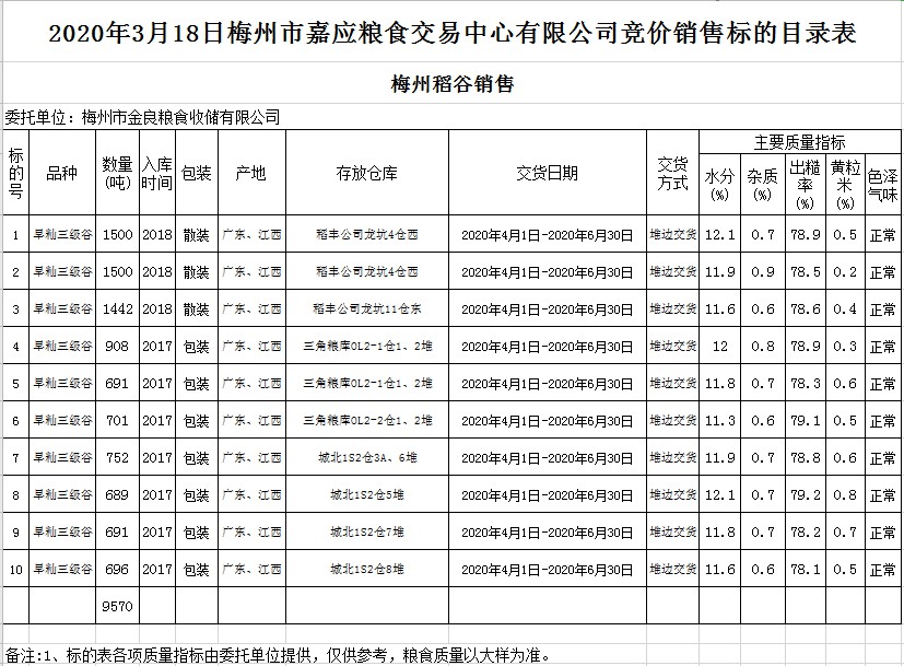 受客戶委托,梅州市嘉應(yīng)糧食交易中心有限公司定于2020年3月18日(星期三)舉辦糧食競價(jià)交易會,梅州市金良糧食收儲有限公司擬銷售2017年、2018年早秈稻9570噸。