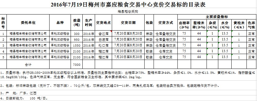 受客戶委托,梅州市嘉應(yīng)糧食交易中心有限公司定于2016年7月19日舉辦糧食競價(jià)交易會,梅州市梅縣區(qū)穗豐糧食收儲有限公司擬采購2016年產(chǎn)早秈三級稻谷7000噸。