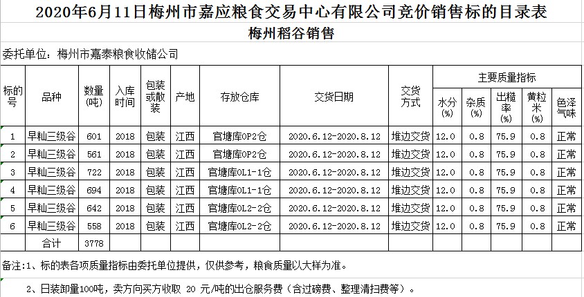 2020年6月11日梅州市嘉泰糧食收儲(chǔ)公司稻谷銷售