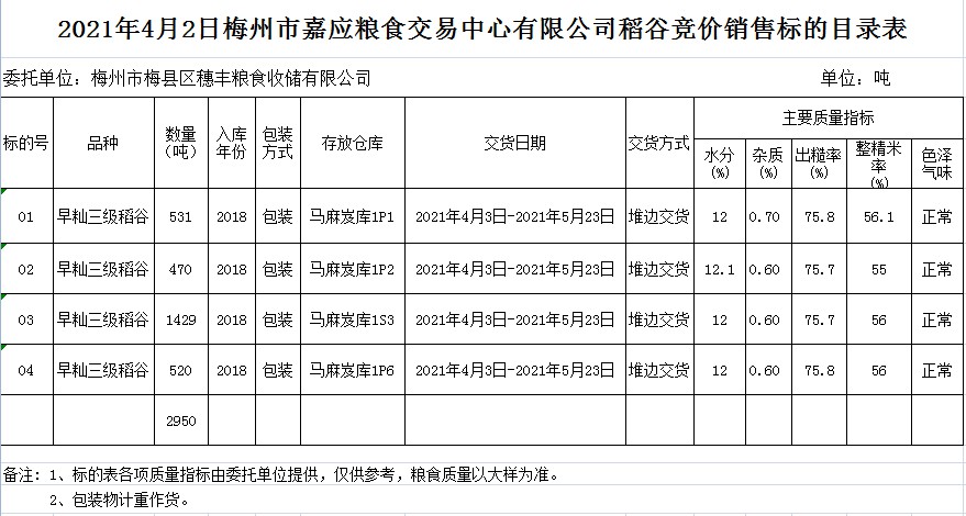 受客戶委托,梅州市嘉應(yīng)糧食交易中心有限公司定于2021年4月2日(星期五)舉辦糧食競價(jià)交易會(huì)。梅州市梅縣區(qū)穗豐糧食收儲(chǔ)有限公司擬銷售2018年早秈稻2950噸。