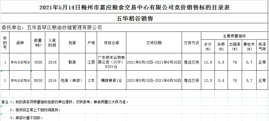 受客戶委托,梅州市嘉應(yīng)糧食交易中心有限公司定于2021年5月14日(星期五)舉辦糧食競價(jià)交易會。五華縣琴江糧油收儲管理有限公司擬銷售2018年早秈稻8530噸。