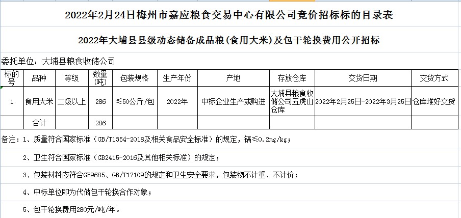 受客戶委托,梅州市嘉應糧食交易中心有限公司定于2022年2月24日(星期四)上午10時在廣東省梅州市彬芳大道南161號梅州市糧食交易中心3樓,舉辦大埔縣縣級動態(tài)儲備成品糧(食用大米)采購公開招標。