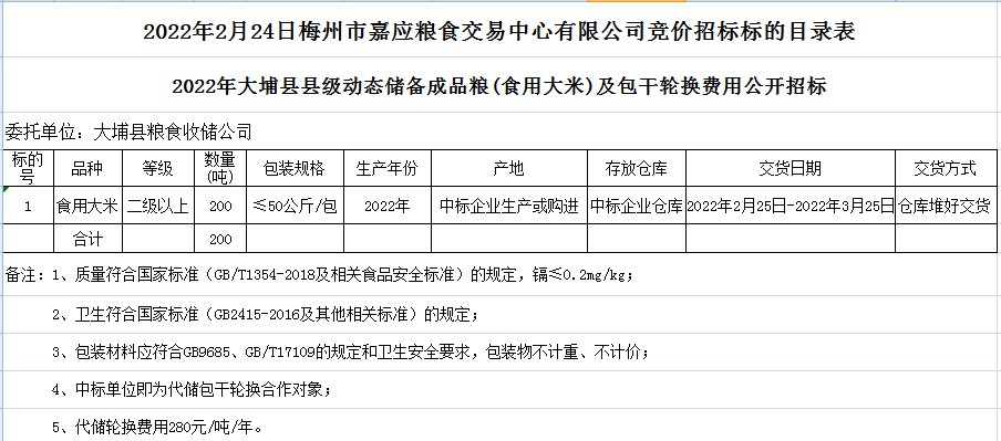 2022年大埔縣縣級(jí)動(dòng)態(tài)儲(chǔ)備成品糧(食用大米)及包干輪換費(fèi)用公開招標(biāo)公告