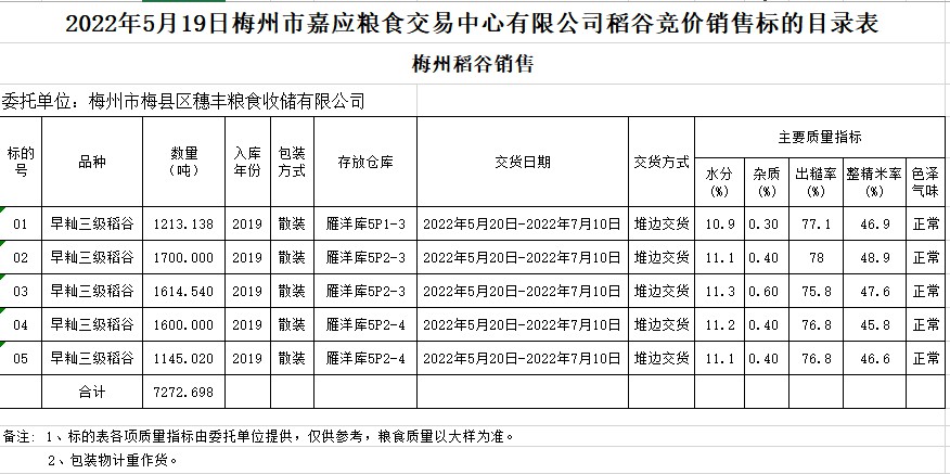 受客戶委托,梅州市嘉應糧食交易中心有限公司定于2022年5月19日(星期四)舉辦糧食競價交易會。梅州市梅縣區(qū)穗豐糧食收儲有限公司擬銷售2019年早秈稻7272.698噸。