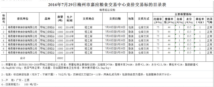 受客戶委托,梅州市嘉應(yīng)糧食交易中心有限公司定于2016年7月29日舉辦糧食競價交易會,梅州市梅縣區(qū)穗豐糧食收儲有限公司擬采購2016年產(chǎn)早秈三級稻谷6892噸。