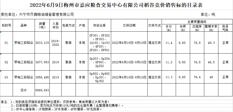 受客戶委托,梅州市嘉應(yīng)糧食交易中心有限公司定于2022年6月9日(星期四)舉辦糧食競價交易會。興寧市齊昌糧油儲備管理有限公司擬銷售2019、2020年早秈稻8969.693噸。