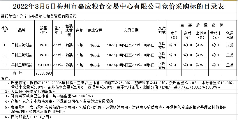 受客戶委托,梅州市嘉應(yīng)糧食交易中心有限公司定于2022年8月5日(星期五)舉辦糧食競(jìng)價(jià)交易會(huì)。興寧市齊昌糧油儲(chǔ)備管理有限公司擬采購(gòu)2022年早秈稻7033.693噸。