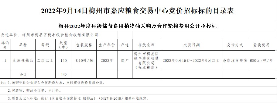 梅縣2022年度縣級(jí)儲(chǔ)備食用植物油采購(gòu)及合作輪換費(fèi)用公開(kāi)招投標(biāo)公告