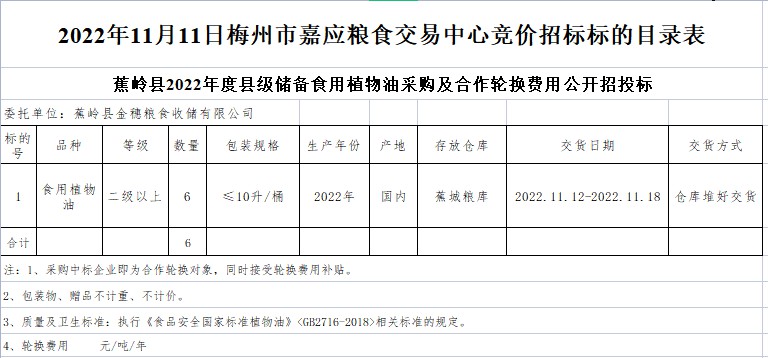 蕉嶺縣2022年度縣級儲(chǔ)備食用植物油采購及合作輪換費(fèi)用公開招投標(biāo)公告