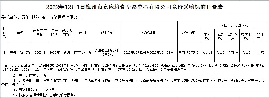 受客戶委托,梅州市嘉應(yīng)糧食交易中心有限公司定于2022年12月1日(星期四)舉辦糧食競(jìng)價(jià)交易會(huì)。五華縣琴江糧油收儲(chǔ)管理有限公司擬采購2022年早秈稻3203.3噸。