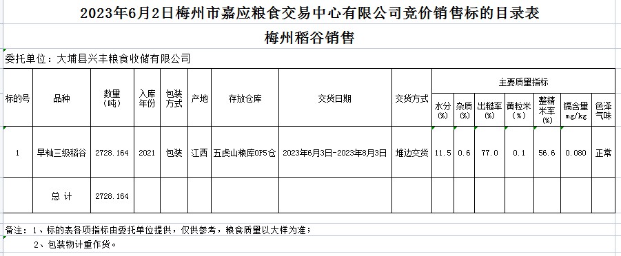 受客戶委托,梅州市嘉應(yīng)糧食交易中心有限公司定于2023年6月2日(星期五)舉辦糧食競價交易會。大埔縣興豐糧食收儲有限公司擬銷售2021年早秈稻2728.164噸。