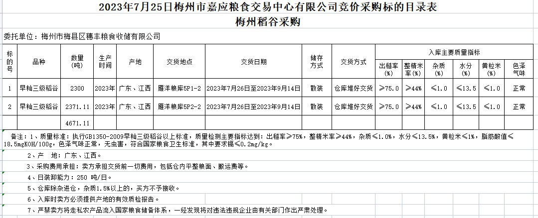 受客戶委托,梅州市嘉應(yīng)糧食交易中心有限公司定于2023年7月25日(星期二)舉辦糧食競(jìng)價(jià)交易會(huì)。梅州市梅縣區(qū)穗豐糧食收儲(chǔ)有限公司擬采購2023年早秈稻4671.11噸。