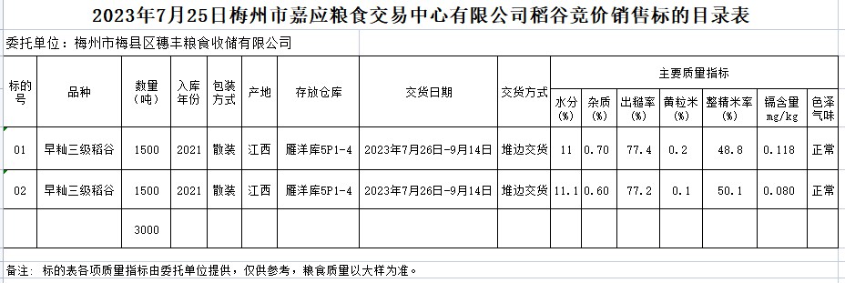 受客戶委托,梅州市嘉應(yīng)糧食交易中心有限公司定于2023年7月25日(星期二)舉辦糧食競價(jià)交易會。梅州市梅縣區(qū)穗豐糧食收儲有限公司擬銷售2021年早秈稻3000噸。