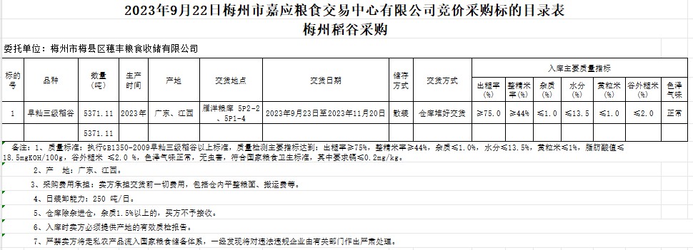 受客戶委托,梅州市嘉應(yīng)糧食交易中心有限公司定于2023年9月22日(星期五)舉辦糧食競價交易會。梅州市梅縣區(qū)穗豐糧食收儲有限公司擬采購2023年產(chǎn)早秈稻5371.11噸。