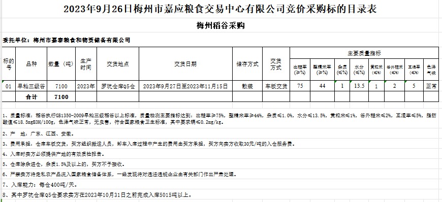 2023年9月26日梅州市嘉泰糧食和物資儲備有限公司稻谷采購