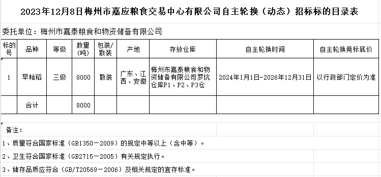 受客戶委托,梅州市嘉應(yīng)糧食交易中心有限公司定于2023年12月8日(星期五)上午10時在廣東省梅州市彬芳大道南161號梅州市糧食交易中心3樓,舉辦梅州市市級儲備糧稻谷8000噸自主輪換(動態(tài))新一輪合作企業(yè)公開招標(biāo)。