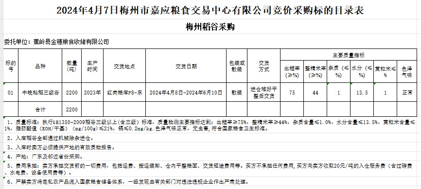 受客戶委托,梅州市嘉應糧食交易中心有限公司定于2024年4月7日(星期天)舉辦糧食競價交易會。蕉嶺縣金穗糧食收儲有限公司擬采購2023年產中晚秈稻2200噸。