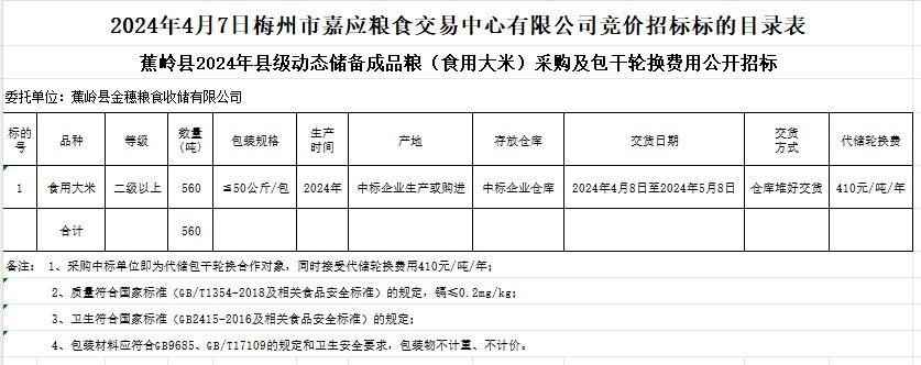 2024年4月7日蕉嶺縣2024年縣級(jí)動(dòng)態(tài)儲(chǔ)備成品糧(食用大米)采購(gòu)及包干輪換費(fèi)用公開(kāi)招標(biāo)公告