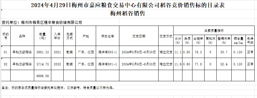 受客戶委托,梅州市嘉應(yīng)糧食交易中心有限公司定于2024年4月29日(星期一)舉辦糧食競價交易會。梅州市梅縣區(qū)穗豐糧食收儲有限公司擬銷售2021年、2022年產(chǎn)早秈稻6696.08噸。