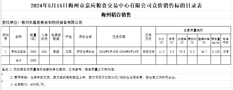 受客戶委托,梅州市嘉應糧食交易中心有限公司定于2024年5月15日(星期三)舉辦糧食競價交易會。梅州市嘉泰糧食和物資儲備有限公司擬銷售2021年產(chǎn)早秈稻2000噸。