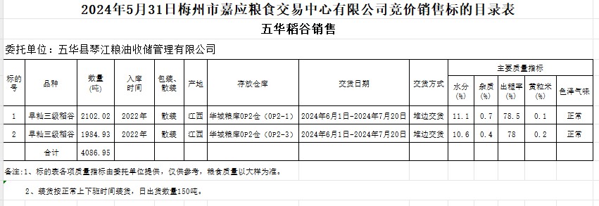 2024年5月31日五華縣琴江糧油收儲(chǔ)管理有限公司稻谷銷售