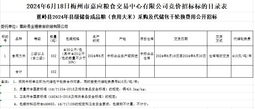 受客戶委托,梅州市嘉應(yīng)糧食交易中心有限公司定于2024年6月18日(星期二)上午10時(shí)在廣東省梅州市彬芳大道南161號(hào)梅州市糧食交易中心3樓,舉辦蕉嶺縣2024年縣級(jí)儲(chǔ)備成品糧(食用大米)采購及代儲(chǔ)包干輪換費(fèi)用公開招標(biāo)。