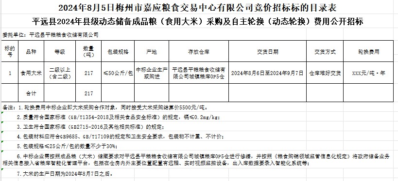 受客戶委托,梅州市嘉應糧食交易中心有限公司定于2024年8月5日(星期一)上午10時在廣東省梅州市彬芳大道南161號梅州市糧食交易中心3樓,舉辦平遠縣2024年縣級動態(tài)儲備成品糧(食用大米)采購及自主輪換(動態(tài)輪換)費用公開招標。