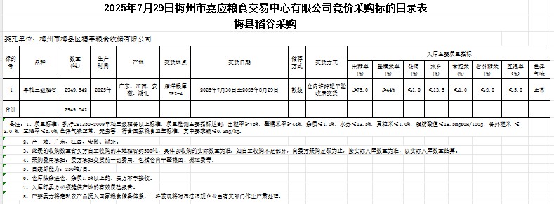 受客戶委托,梅州市嘉應糧食交易中心有限公司定于2025年7月29日(星期二)舉辦糧食競價交易會。梅州市梅縣區(qū)穗豐糧食收儲有限公司擬采購2025年產早秈稻谷2949.542噸。
