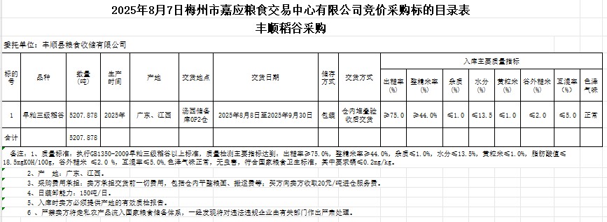受客戶委托,梅州市嘉應(yīng)糧食交易中心有限公司定于2025年8月7日(星期四)舉辦糧食競價交易會。豐順縣糧食收儲有限公司擬采購2025年產(chǎn)早秈稻谷5207.878噸。