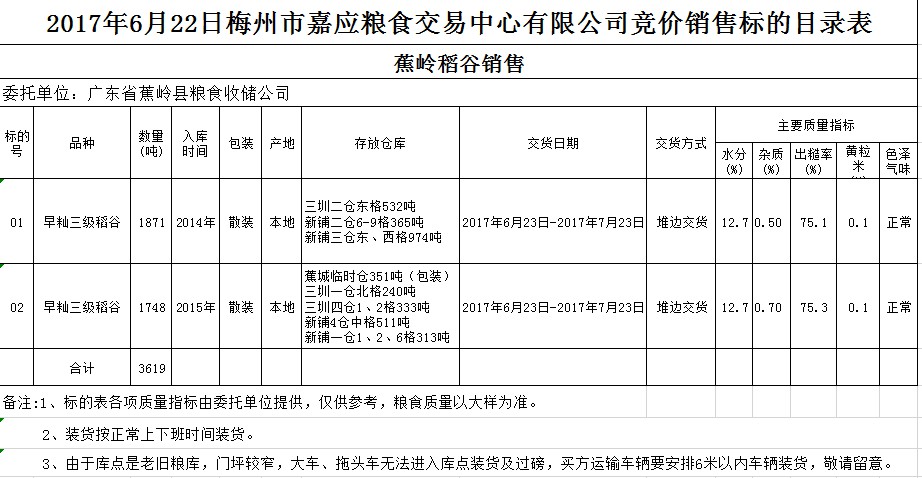 受客戶委托,梅州市嘉應(yīng)糧食交易中心有限公司定于2017年6月22日舉辦糧食競(jìng)價(jià)交易會(huì),廣東省蕉嶺縣糧食收儲(chǔ)公司擬銷售2014、2015年早秈三級(jí)稻谷共3619噸。