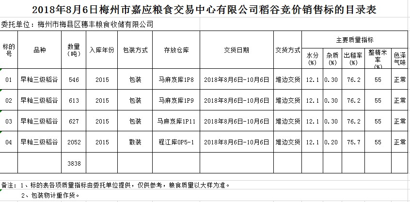 受客戶委托,梅州市嘉應(yīng)糧食交易中心有限公司定于2018年8月6日(星期一)舉辦糧食競價(jià)交易會,梅州市梅縣區(qū)穗豐糧食收儲有限公司擬銷售早秈稻3838噸。